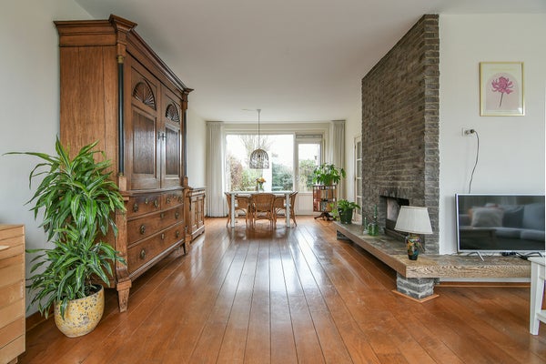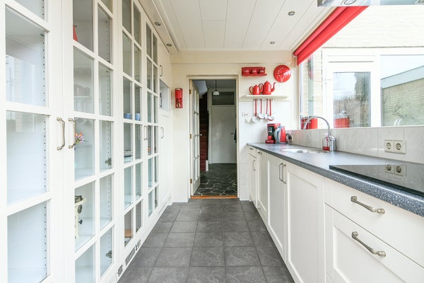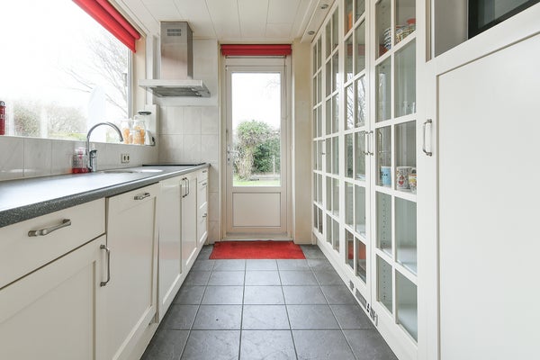 Entree, hal met toilet voorzien van wandcloset en fontein, en meterkast. De lichte doorzonwoonkamer met open haard en praktische provisiekast biedt een prettig, ruimtelijk uitzicht en veel natuurlijk licht. Aan de achterzijde bevindt zich de keuken, uitgerust met diverse inbouwapparatuur en een stijlvolle vitrinekast in bijpassende stijl. Vanuit zowel de woonkamer als de keuken is er directe toegang tot de fraai aangelegde achtertuin met twee terrassen, waar u heerlijk kunt genieten van rust en privacy. Vanuit de tuin is tevens de verwarmde garage bereikbaar.
