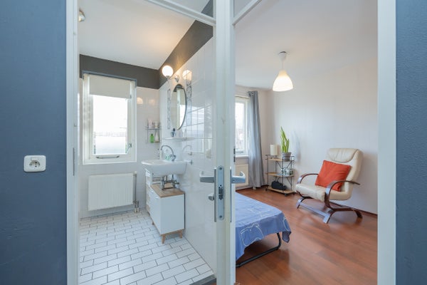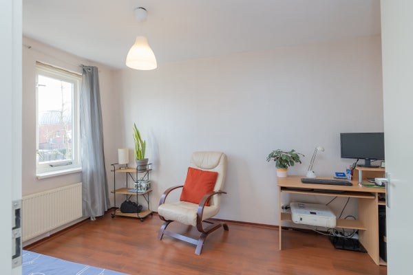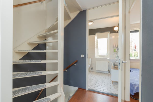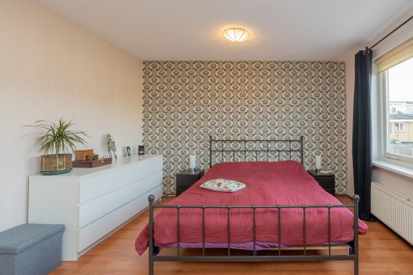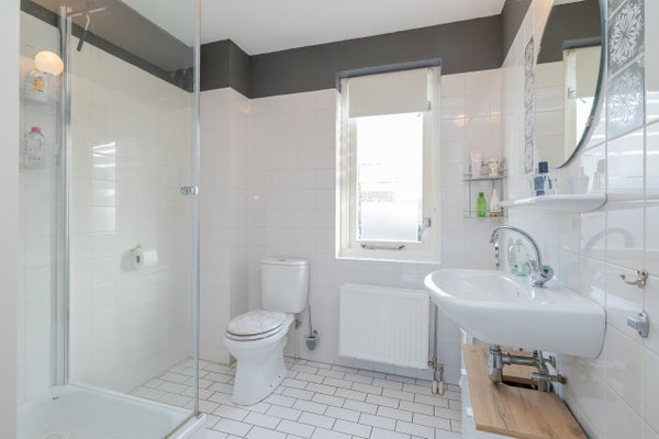 Overloop met toegang tot twee ruime slaapkamers (voorheen drie), waardoor extra royale kamers zijn ontstaan. De badkamer is aan de voorzijde van de woning gesitueerd en uitgevoerd in een lichte kleurstelling. Deze is voorzien van een douchecabine, tweede toilet, wastafel en radiator.