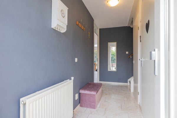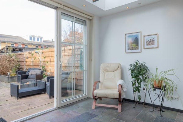 Entree, hal met meterkast, trapkast en toilet met fontein. De uitgebouwde woonkamer is tuingericht en kenmerkt zich door veel lichtinval en een prettige ruimtelijkheid. De marmeren en leistenen vloer met vloerverwarming zorgt voor extra comfort. Via de dubbele schuifpui is er een directe verbinding met de diepe achtertuin op het noordwesten, waar je tot in de middag- en avonduren kunt genieten van de zon. De tuin is verzorgd aangelegd met sierbestrating en beschikt over een houten berging met elektra en een praktische achterom.