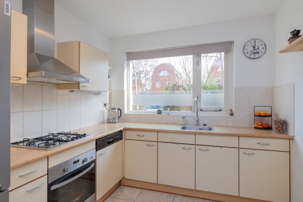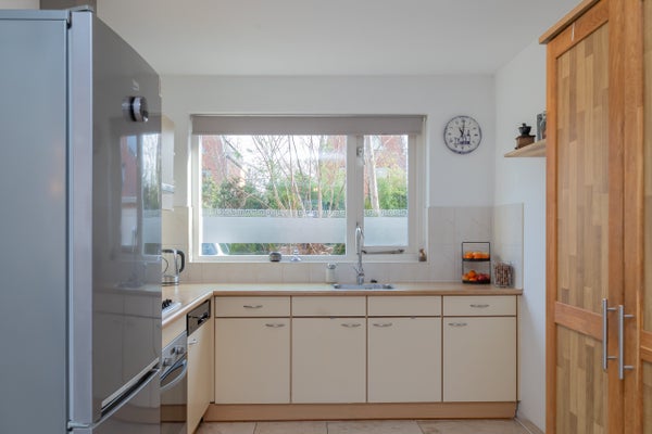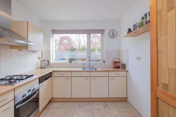 De open keuken bevindt zich aan de voorzijde van de woning en is uitgevoerd in een L-vormige opstelling met lichte kastfronten en diverse inbouwapparatuur, waaronder een 4-pits kookplaat, afzuigkap, oven en Amerikaanse koelkast.