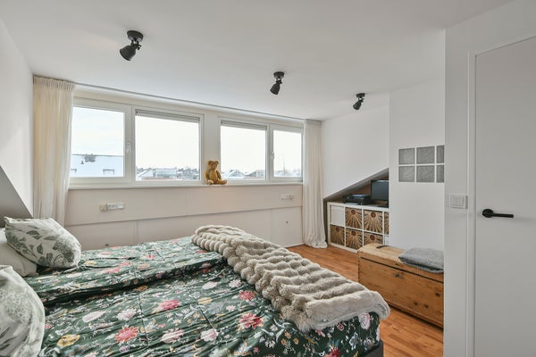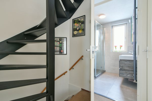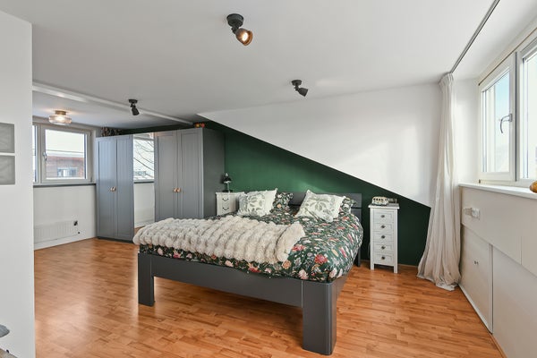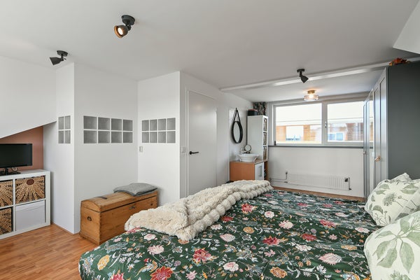 Overloop met toegang tot de stook-/wasruimte. Hier is ook de mechanische ventilatie (2024) gesitueerd. Tevens is vanuit deze ruimte toegang tot de open vliering met veel praktische bergruimte. Tevens is de slaapkamer vanaf de overloop toegankelijk. Deze kamer is voorzien van een groot dakkapel. Via een groot raam aan de voorzijde van de woning, alsmede via het dakkapel is er veel lichttoetreding in deze kamer. Bovendien zijn er knieschotten met bergruimte en er is een wastafelmeubel.