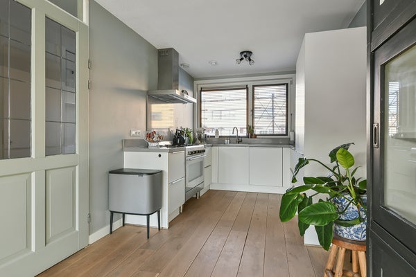 De keuken bevindt zich aan de voorzijde van de woning. De keuken is uitgevoerd met diverse (inbouw)apparatuur, waaronder; een vaatwasser, 5 pits gasfornuis/oven, afzuigkap en koel-/vriescombinatie.