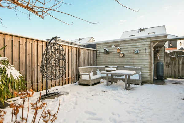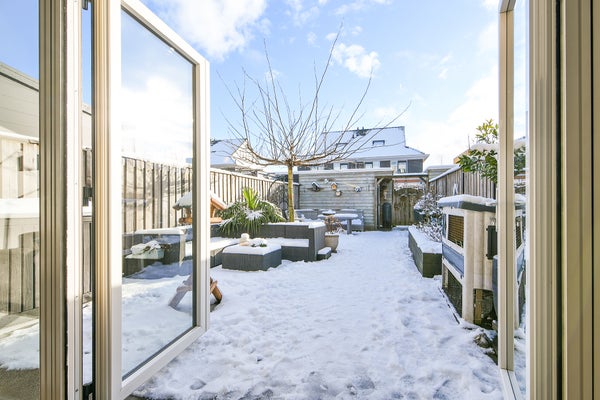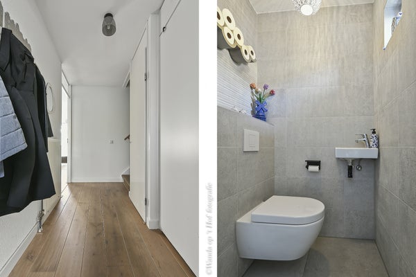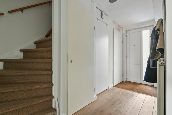 Entree, hal, meterkast, garderobe, trapkast en toilet met wandcloset en fontein (bj. 2021). De lichte woonkamer heeft via een dubbele deur toegang tot de ruim dertien meter diepe achtertuin. In de tuin bevindt zich een houten berging welke is voorzien van elektra.