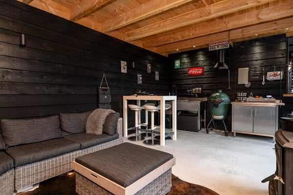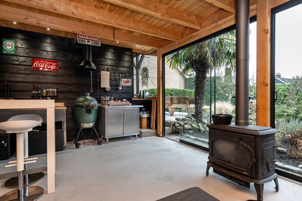 Glazenschuifwand, betonvloer, keukenblok met close-in boiler, afzuiging, houtkachel (ter overname), wand spots, bar met 4 bar krukken, Green Egg (ter overname), beamerscherm, verlichting en elektra.