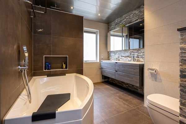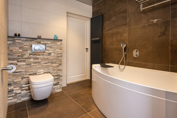 Plavuizenvloer v.v. vloerverwarming, zwevend toilet, ligbad, inloopdouche met regendouche, dubbele wastafel met meubel, spots in plafond, mechanische afzuiging, handdoeken radiator en geheel betegeld.