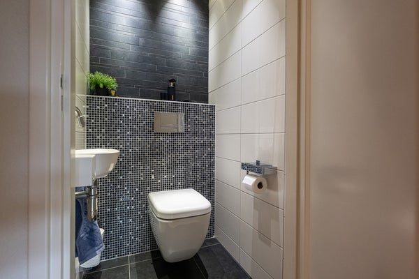 Plavuizenvloer, zwevend, toiletfontein, mechanische ventilatie, spots in plafond en geheel betegeld.