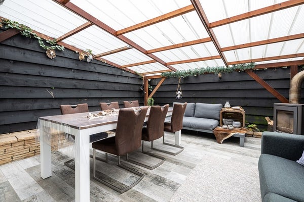 Toegang vanuit woonkamer d.m.v. schuifpui, eigen ingang, plavuizenvloer, terrasheater, houtkachel, verlichting en elektra.
