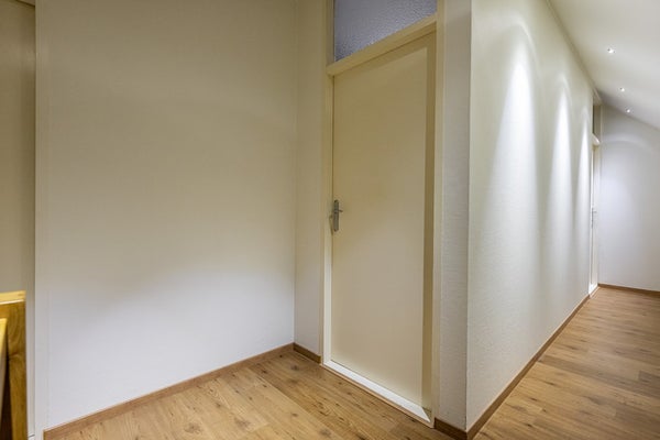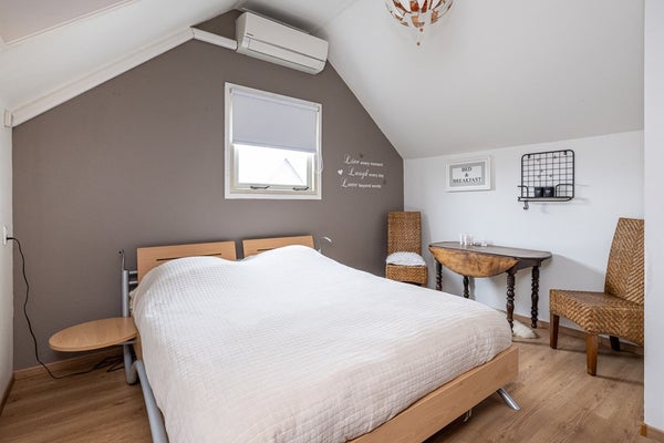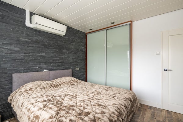 Laminaatvloer, airco, radiator, schuifkast en spots in plafond.