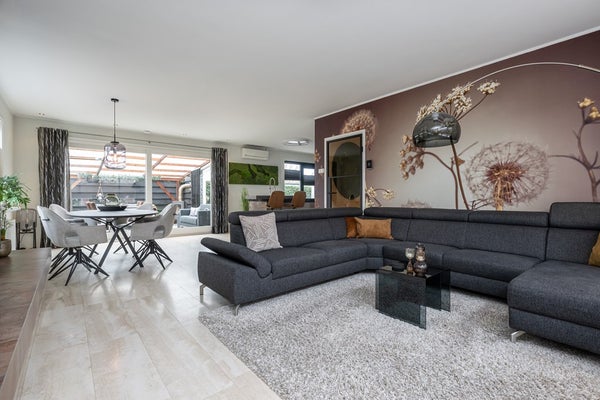 De keuken en woonkamer lopen prettig in elkaar over en aan de woonkamer grenst een serre die aanvoelt als een verlengstuk van uw leefruimte. Via de schuifpui stapt u zo deze lichte, sfeervolle plek in, waar u beschut kunt zitten en toch het buitengevoel behoudt. Of het nu lente, zomer of een frisse herfstdag is: hier zit u heerlijk, met een mooi zicht op de tuin.