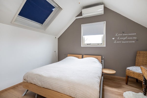Laminaatvloer, Velux dakraam met verduistering, radiator en airco.