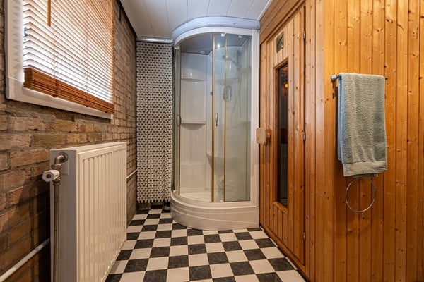 Tegelvloer, radiator, spots in plafond en douche cabine (los gekoppeld).