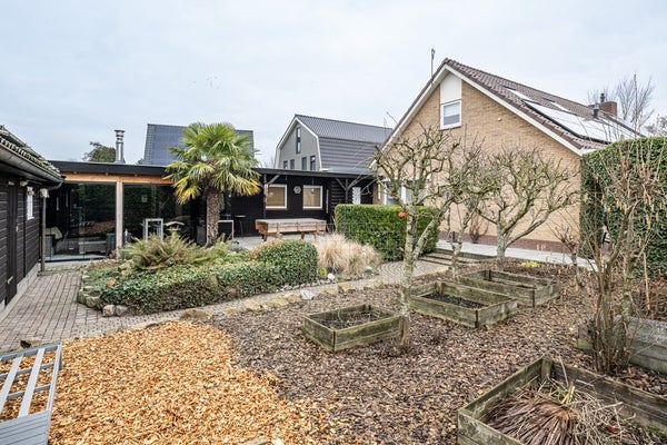 Deels terras tegels, deels houtsnippers, deels borders, achterom, zonnescherm handbediend en een kippenren.