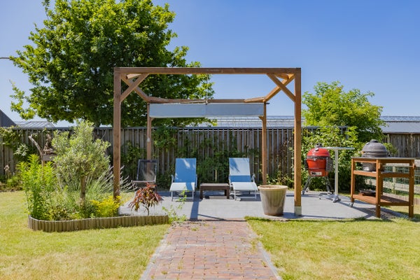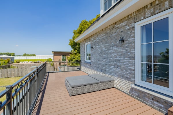 Achter de woning wacht een royale veranda met glazen schuifwanden – dé plek om te ontspannen of te genieten van lange zomeravonden. Ook op koelere dagen zit je hier beschut en uit de wind; al bij een beetje zon is het verrassend aangenaam, en met een heater of haard maak je het extra comfortabel. Dankzij de aanwezige televisieaansluiting is dit ook een heerlijke plek voor een avondje series of sport kijken.