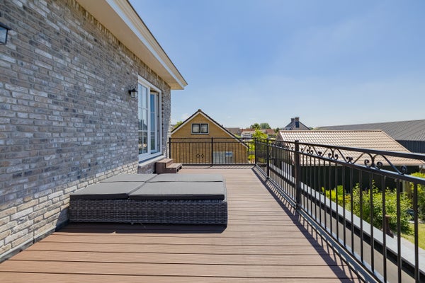 De overloop met vide zorgt voor een extra ruimtelijk gevoel. Op deze verdieping bevinden zich vier slaapkamers, waaronder een royale ouderslaapkamer met inloopkast en openslaande deuren naar een ruim dakterras. Op het dakterras geniet je van de warme avondzon – een perfecte plek om helemaal tot rust te komen.