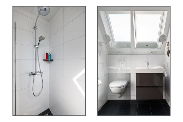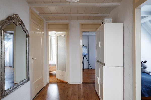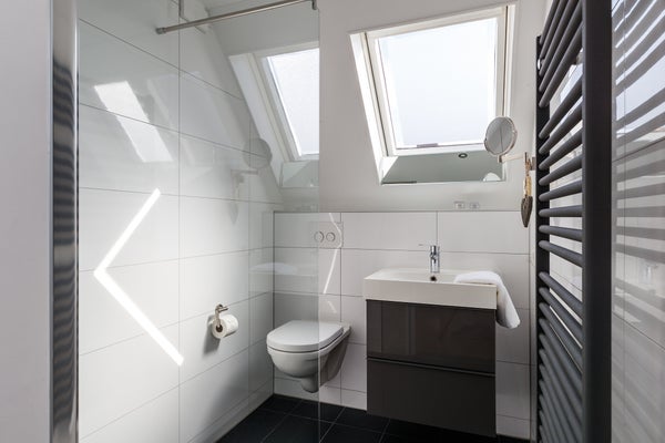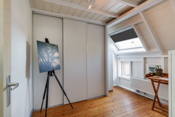 Ruime overloop met toegang tot drie ruime slaapkamers, waarvan de grootste is voorzien van een fraaie erker. De badkamer is in 2019 volledig vernieuwd en uitgevoerd met een inloopdouche, hangend toilet, wastafelmeubel en dakraam voor extra licht en ventilatie.