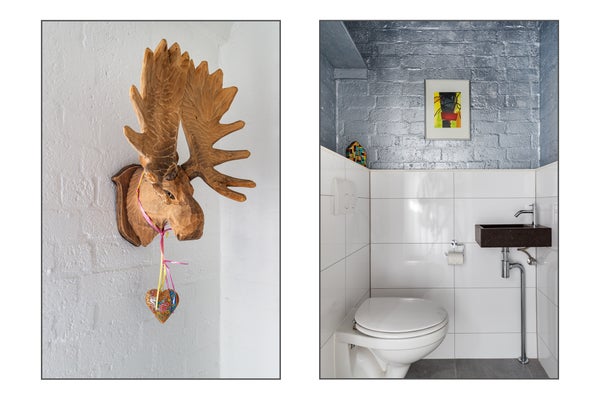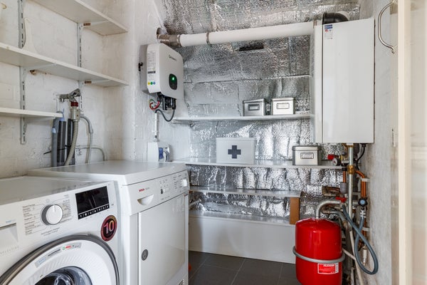 Daarnaast is er een aparte wasruimte met aansluitingen voor wasmachine en droger, de HR-combiketel (Remeha Avanta 35C CW5) en de omvormer van de zonnepanelen.