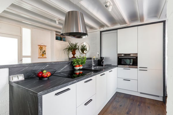 Entree in de hal met toilet en meterkast. Vanuit de hal toegang tot de sfeervolle woonkamer, voorzien van een eikenhouten vloer, houtkachel en veel licht. De open keuken (2021) in L-opstelling is modern uitgevoerd en uitgerust met diverse inbouwapparatuur, waaronder een recirculatiekap met de uitstraling van een hanglamp, vaatwasser, combi-oven/magnetron, inductieplaat, koelkast, vriezer en close-in boiler.