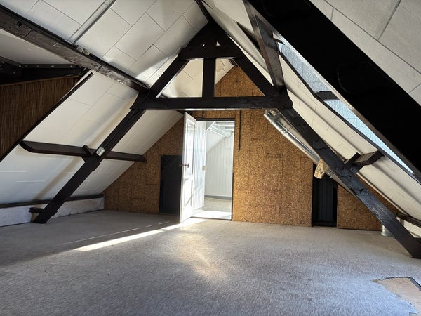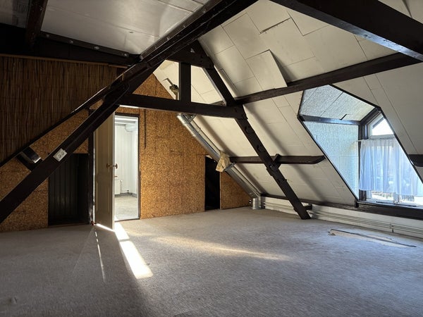 Grote open overloop / zolder met waarbij de oude spanten zichtbaar zijn.
