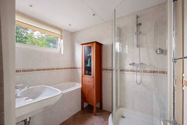 Aan de achterzijde bevindt zich de derde slaapkamer met directe toegang tot een tweede badkamer, voorzien van ligbad, douchecabine en wastafel.