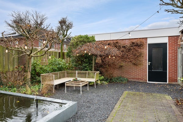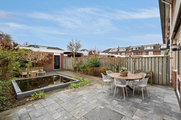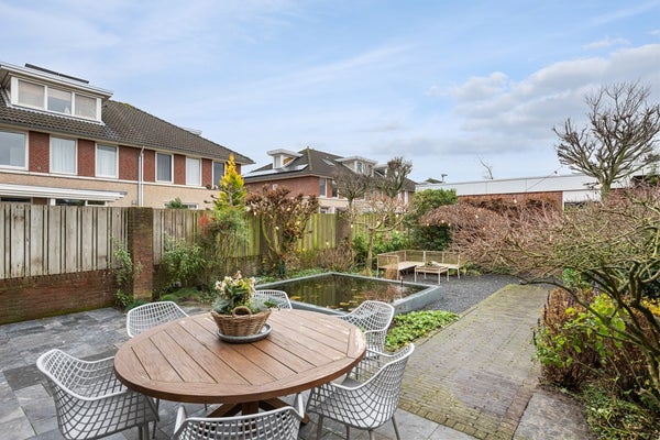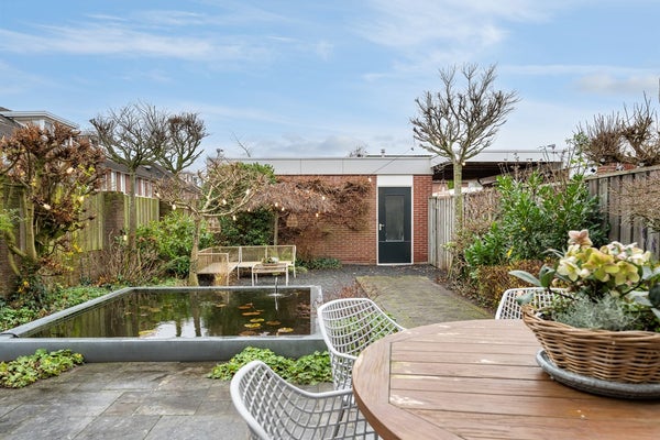 Aan 15 meter lange en 7,50 brede achtertuin zul je veel woonplezier beleven. Door de goede zonligging (zuidwesten) kun je heerlijk van de zon genieten. De tuin is ingericht met gevarieerde beplanting, fijne terrassen en een moderne vijver.