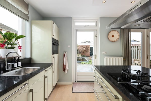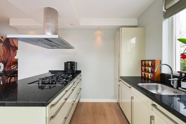 Inbouwapparatuur: gaskookplaat, afzuigkap, combioven, koelkast, vriezer en vaatwasser.