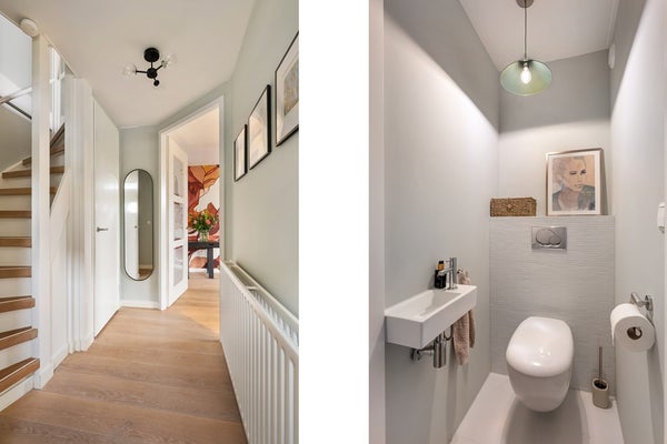 Entree aan zijkant van het huis; hal met meterkast, modern toilet, op maat gemaakte garderobekast en trap naar de verdieping;