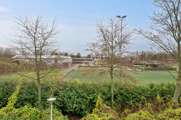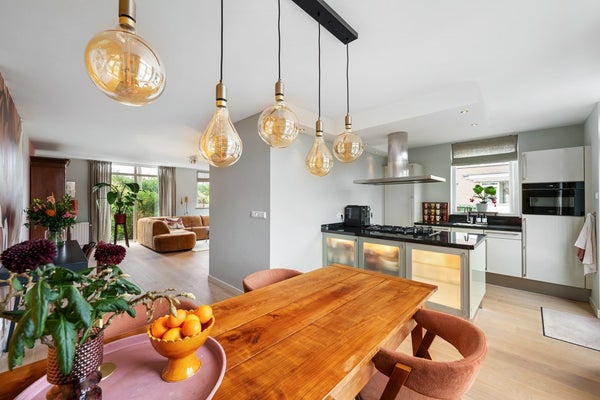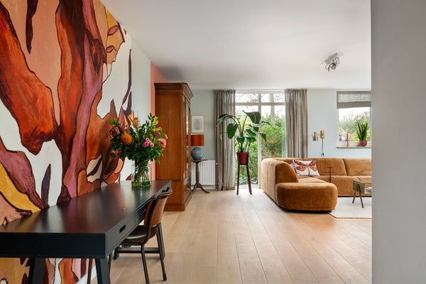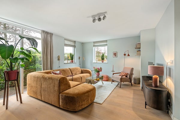 Sfeervolle woonkamer onderverdeeld in een zitgedeelte aan de voorzijde en een eetgedeelte grenzend aan de keuken. Doordat er rondom veel ramen zijn toegepast, is de woonkamer aangenaam licht. Aan de voorzijde ligt het huis aan een plantsoen en wandelpad. Vanaf de kamer kijk je dus uit op 'het groen'.