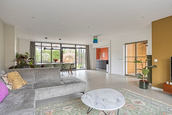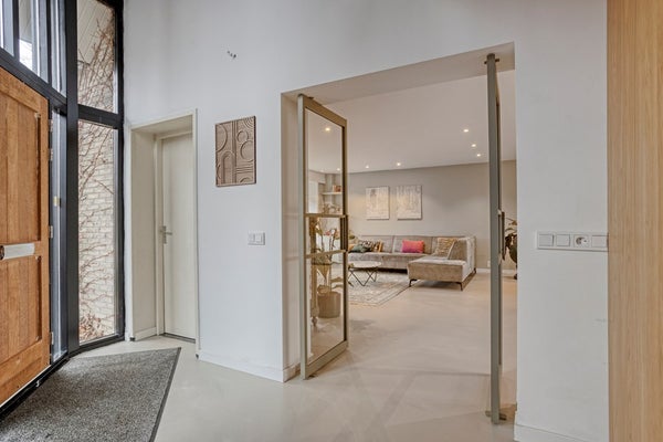 De hele begane grond is afgewerkt met een naadloze gietvloer met vloerverwarming.
