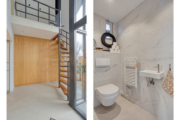 Ruime hal met modern toilet, prachtige opmaat gemaakte garderobekast en spiltrap naar de verdieping.