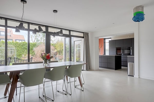 In de kamer is meer dan voldoende plaats voor een grote eettafel en een zitgedeelte.