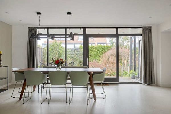 Royale en lichte woonkamer (ca. 8.48 x 6.01m) met brede schuifpui naar terras en tuin.