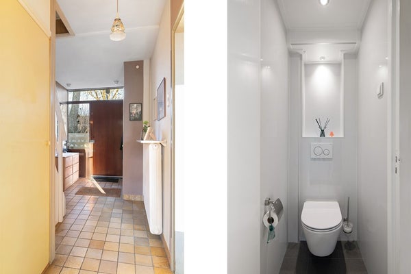 Entree, ruime hal met meterkast (vernieuwd), bergkast, modern toilet en trap naar de verdieping;