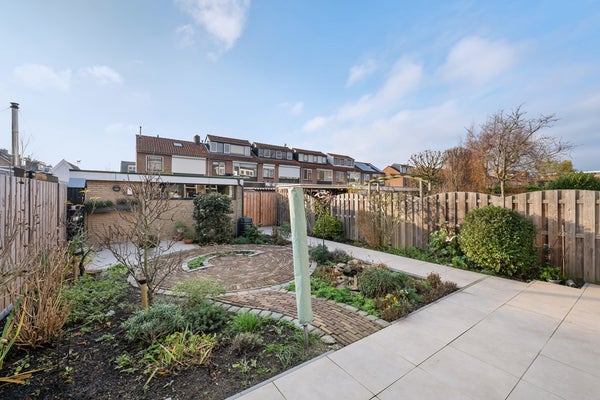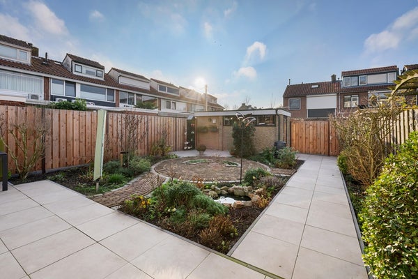 Door de hoekligging is de tuin éxtra breed. De 13 meter lange en 7,50 meter brede achtertuin is mooi aangelegd met gevarieerde beplanting en betegelde terrassen. Achter in de tuin staat een stenen berging. Aan de zijkant van het huis een houten berging.
