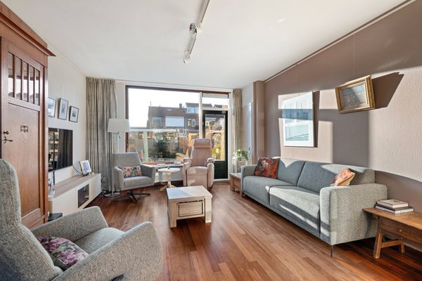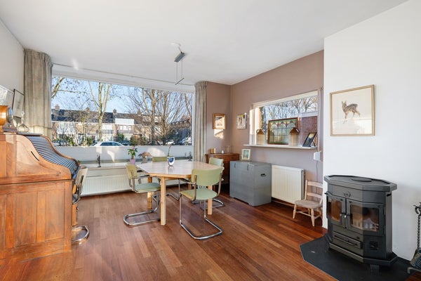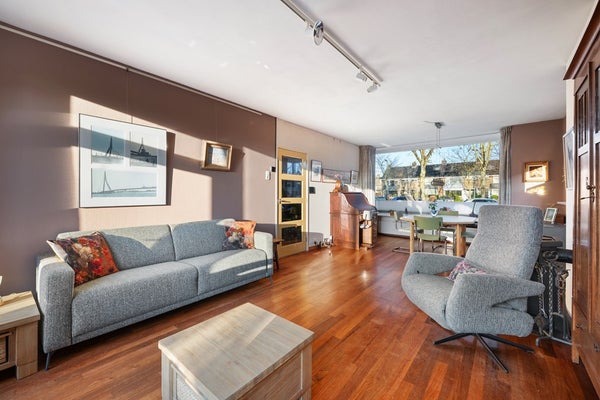 Aangenaam lichte woonkamer (ca. 8.45 x 3.98m) met sfeervolle erker. Halverwege de kamer staat de schouw met houtkachel. Aan de voorzijde is altijd wat te zien en geniet je van een leuk en levendig uitzicht. Aan achterzijde deur naar terras en tuin.