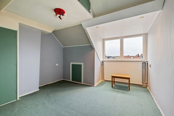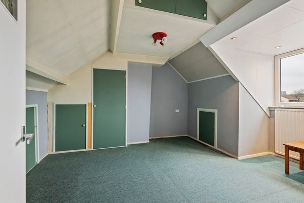 Grote zolderkamer met hoge nok. Met inbouwkasten. Bergruimte onder schuine dakvlak.