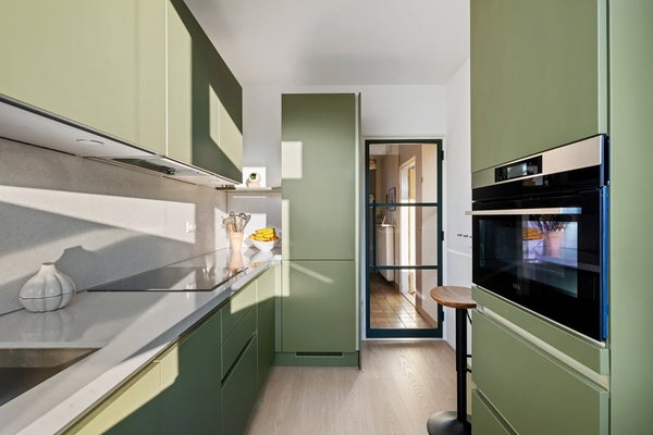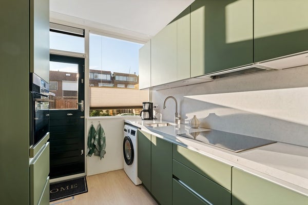Via trendy deur, toegang naar afgesloten keuken (ca. 3.43 x 2.21m) met moderne, olijfgroene keukeninrichting uit 2024! Inbouwapparatuur: keramische kookplaat, afzuigkap, combioven, koel/vrieskast, vaatwasser en Quooker. Aansluiting voor de wasmachine. Deur naar achtertuin.
