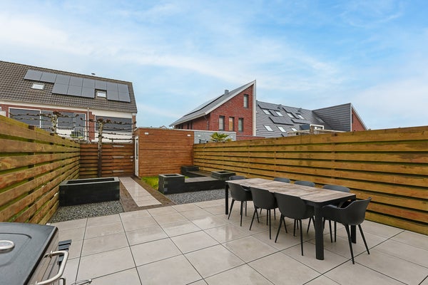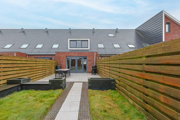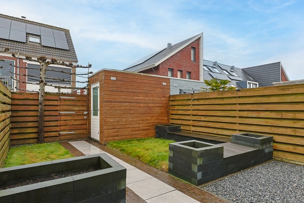 Via de woonkamer heb je direct toegang tot de achtertuin, waardoor binnen en buiten op een prettige manier in elkaar overlopen. Dit zorgt voor veel lichtinval en een ruimtelijk gevoel, en maakt het ideaal om op zonnige dagen de deuren open te zetten. De moderne achtertuin is verzorgd aangelegd en biedt volop ruimte om te ontspannen, te tuinieren of gezellig buiten te zitten met familie en vrienden. Achterin de tuin staat een houten berging, perfect voor het netjes opbergen van fietsen, gereedschap en tuinspullen.