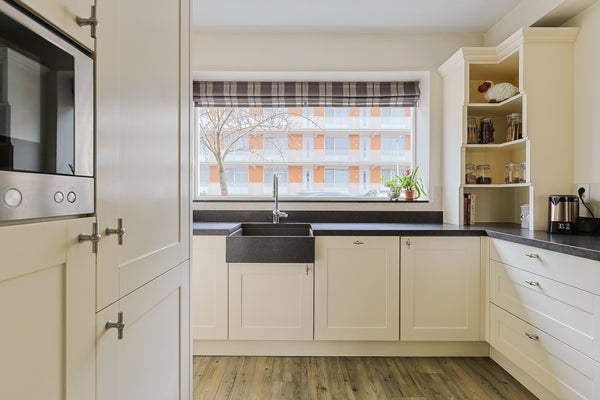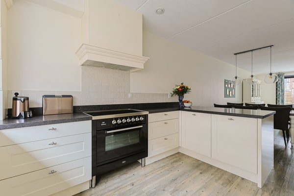 Aan de voorzijde ligt de royale keuken, voorzien van diverse inbouwapparatuur met o.a. inductie kookplaat, afzuigkap, oven, magnetron, koel-vriescombinatie en afwasmachine. De begane grond is afgewerkt met een mooie pvc vloer.
