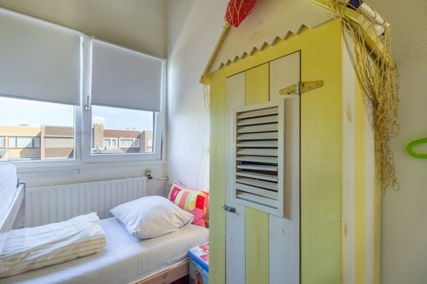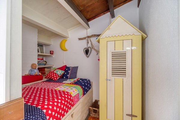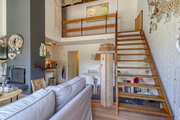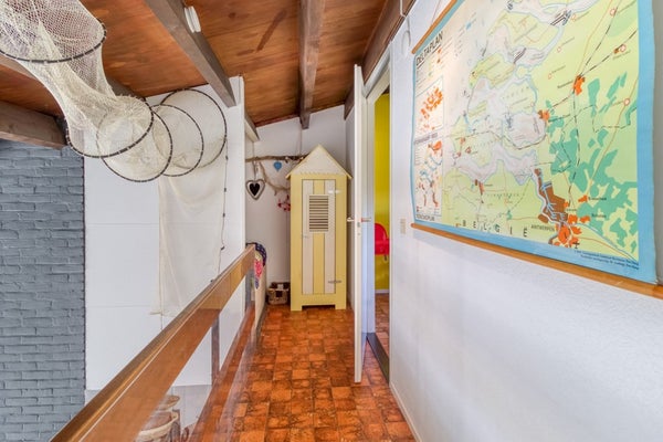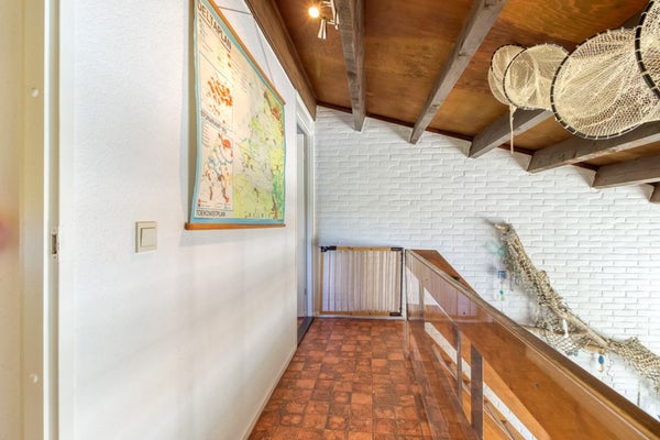 Via de trap in de woonkamer is de eerste verdieping te bereiken. Hier bevindt zich een overloop van waaruit de 2 slaapkamers op deze verdieping te bereiken zijn. De overloop is een stukje vergroot en hier is een extra slaapgelegenheid gecreëerd.