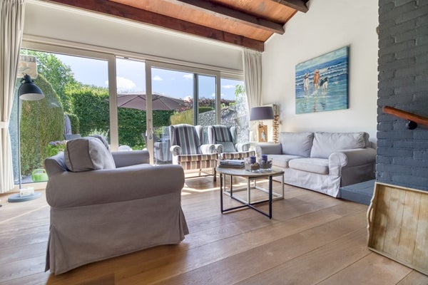 Bij binnenkomst in de woonkamer komt u eerst in het keukengedeelte met eethoek. De keuken is voorzien van: 4-pits gaskookplaat, afzuigkap, spoelbak, koelkast, magnetron en vaatwasmachine. De eethoek ligt twee tredes lager als de zithoek en staan in open verbinding met elkaar. In de zithoek is er een haard voor de gezellige winterse avonden en een schuifdeur naar het terras en de tuin. Door de gunstige zonligging en de grote ramen schijnt de zon aangenaam binnen in de woonkamer.