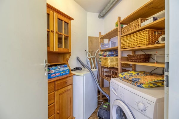 Naast de keuken bevindt zich de bijkeuken met wasmachine-aansluiting en ruimte voor het opbergen van huishoudelijke spullen.