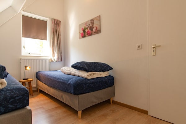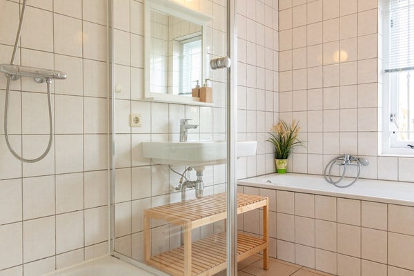Eveneens op de begane grond; één slaapkamer, een badkamer met ligbad, douche en wastafel en een apart toilet met fonteintje. Hiermee is de woning dus volledig begane grond te bewonen.