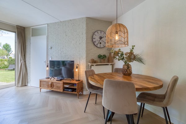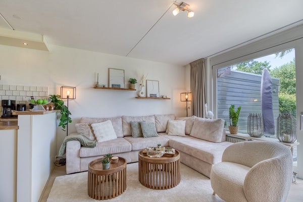 Via de entree komt u in de hal met meterkast en ruimte voor de garderobe. Vanuit de hal is er toegang tot de badkamer, een apart toilet met fonteintje en de woonkamer. De badkamer is voorzien van douche en wastafel. De woonkamer met zit- en eethoek heeft een schuifdeur naar het terras en staat in open verbinding met de keuken. De keuken is voorzien van; 4-pits gaskookplaat, afzuigkap, spoelbak, koelkast met vriesvak en vaatwasmachine. Naast de keuken bevindt zich de bijkeuken met combi-magnetron, wasmachine, droger en ruimte voor het opbergen van huishoudelijke spullen.