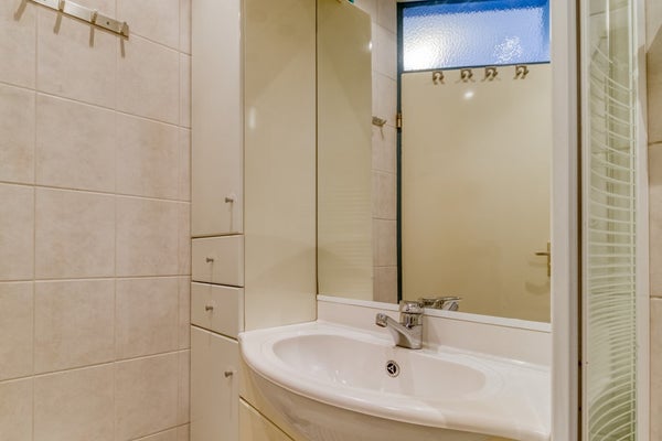 Via de entree komt u in de hal met meterkast en ruimte voor de garderobe. Vanuit de hal is er toegang tot de badkamer, een apart toilet met fonteintje en de woonkamer. De badkamer is voorzien van douche en wastafel. De woonkamer met zit- en eethoek heeft een schuifdeur naar het terras en staat in open verbinding met de keuken. De keuken is voorzien van; 4-pits gaskookplaat, afzuigkap, spoelbak, wasmachine en losse koel/vriescombinatie. Ten opzichte van de originele indeling is de berging weg en is de keuken opgeschoven. Hierdoor is er meer plaats in de woonkamer.