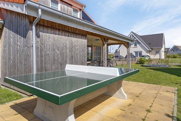 De indeling omvat een ruime hal die leidt naar de woonkamer, slaapkamer met badkamer, en een open keuken met moderne inbouwapparatuur. Er is ook een bijkeuken met wasmachine en droger. De achtertuin heeft een overdekt terras, een betonnen tafeltennistafel en een trampoline. Op de eerste verdieping zijn vier slaapkamers en twee badkamers, één met infraroodsauna. De woning, gebouwd in 2018, is volledig geïsoleerd en voorzien van zonnepanelen. Privéparkeergelegenheid voor twee voertuigen met oplaadpunt is ook aanwezig.