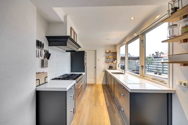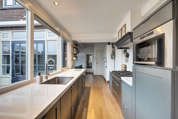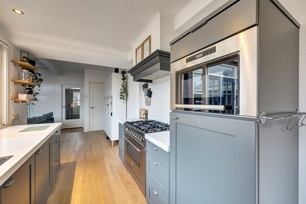 De keuken is modern uitgevoerd en voorzien van diverse inbouwapparatuur, waaronder een groot fornuis, vaatwasser en Quooker. Aansluitend bevindt zich de praktische bijkeuken met aansluitingen voor wasmachine en droger en extra bergruimte. Vanuit zowel de woonkamer als de bijkeuken bereikt u de achtertuin.
