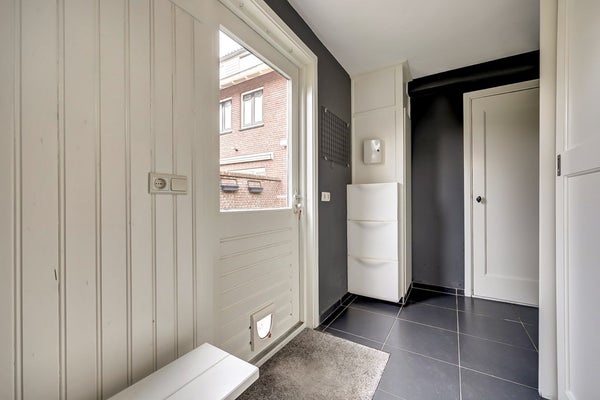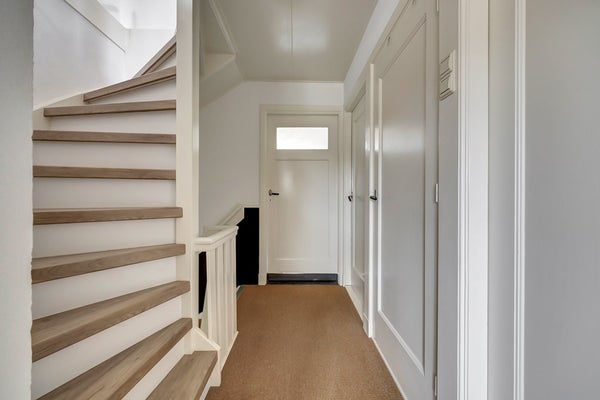 Entree via de karakteristieke hal met originele granitovloer. Hier bevinden zich het moderne wandcloset met fonteintje en een praktische trapkast die vanuit de woonkamer te bereiken is. De ruime woonkamer beschikt over een parketvloer, schouw, hoge plafonds en openslaande deuren naar de tuin. De moderne keuken is volledig uitgerust en staat in directe verbinding met de bijkeuken, waar zich de aansluitingen voor wasmachine en droger bevinden. Vanuit de bijkeuken is eveneens de achtertuin bereikbaar. De tuin is verzorgd aangelegd en beschikt over een veranda en een ruime garage achterin.
