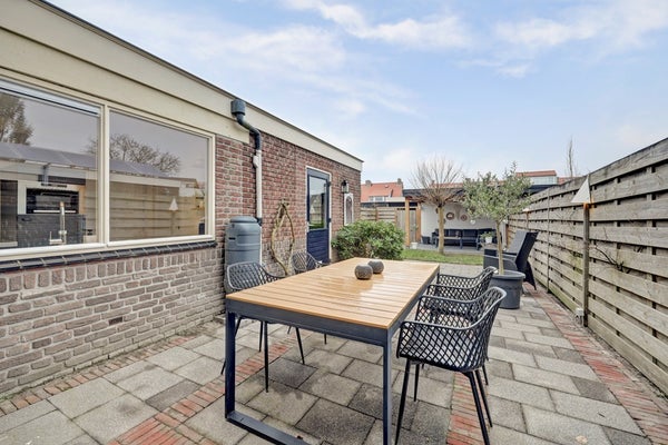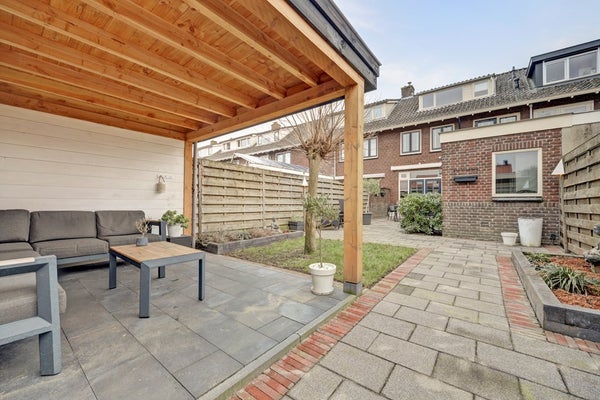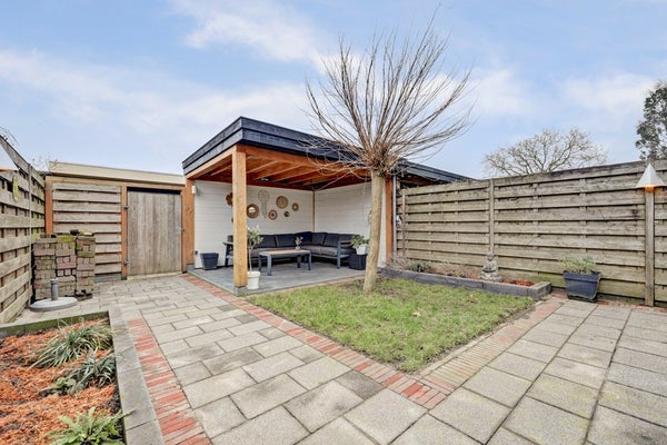 De achtertuin ligt op het westen en is een heerlijke plek om te ontspannen. Hier geniet u van de middag- en avondzon, met een combinatie van groen, bestrating en een gezellige veranda. Achterin de tuin staat een ruime garage, geschikt voor parkeren of extra opslag.