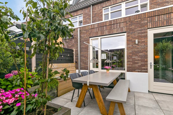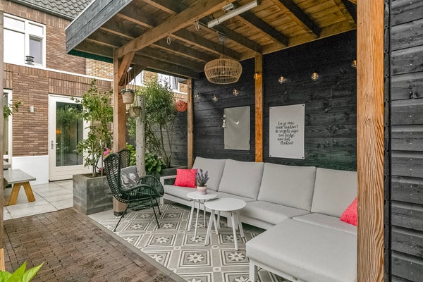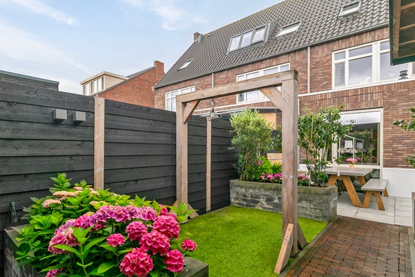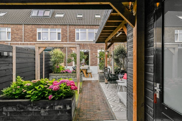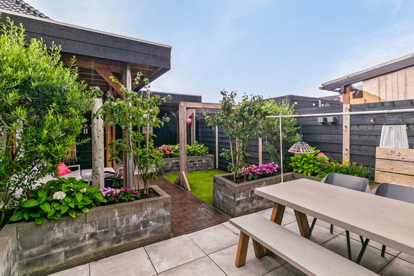 De voortuin op het zonnige zuiden is een fijne plek om buiten te zitten, met uitzicht op het park en de spelende kinderen. Deze tuin is ingedeeld met een beukenhaag, sierbestrating en gevarieerde beplanting. Via het portaal loop je vanuit de woning naar de fraaie achtertuin met een veranda/overkapping, berging, een groot terras en stijlvolle plantenbakken. Mooie elementen zijn de zwarte schuttingen met buitenverlichting, de schommel, sierbestrating en de vaste bank bij het grote terras. Dit is het voorbeeld van een tuin met sfeer, groen en waarin optimaal gebruik is gemaakt van de beschikbare ruimte.