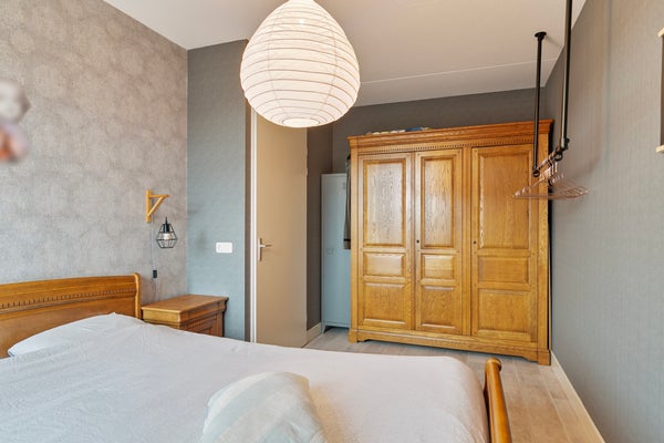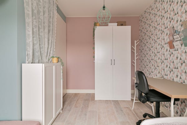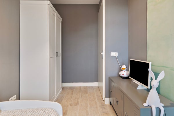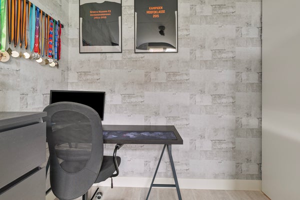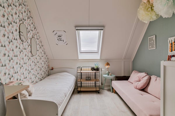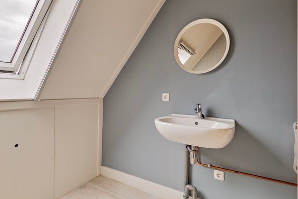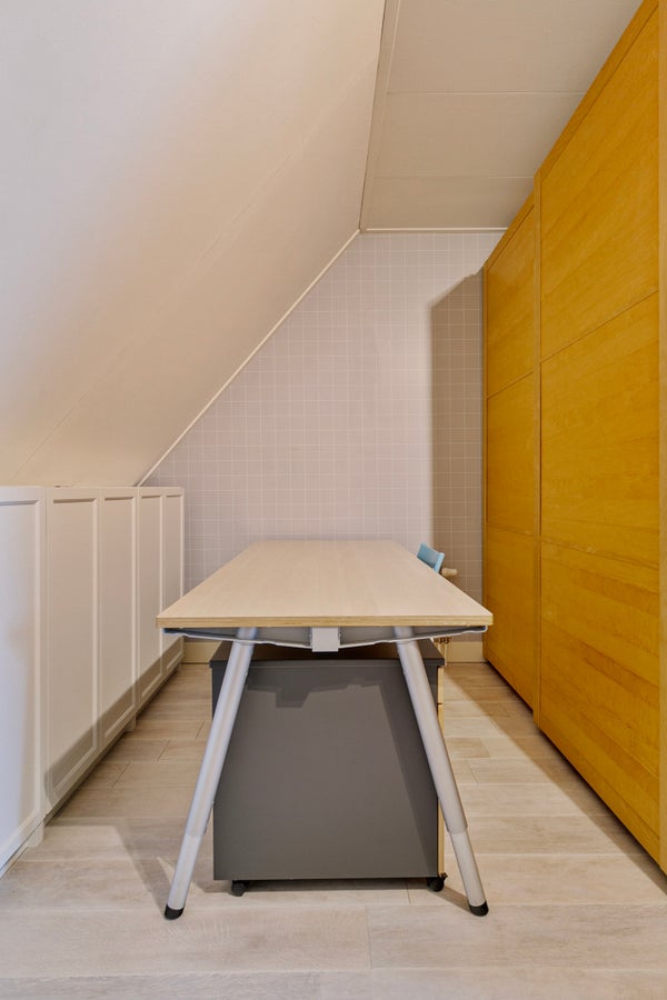 De overloop is veel meer dan een plek om spullen op te slaan. Aan de voorzijde is een werkplek gemaakt en er staat een grote kastenwand met schuifdeuren. BBij het dakraam aan de achterzijde, naast de wastafel, vind je de opstelling van de cv-installatie. Ook bevindt zich op deze verdieping een ruime vierde slaapkamer. Welke invulling geef jij aan deze verdieping?
